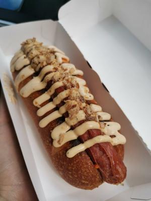 - хот-дог с баварской колбаской: булка, соус кунжутный, морковь по-корейски, огурец маринованный, колбаска, лук фри, соус спайси