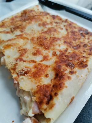 - блин с ветчиной и сыром: ветчина, сыр моцарелла, сыр пармезан, соус сырный, соус чесночный