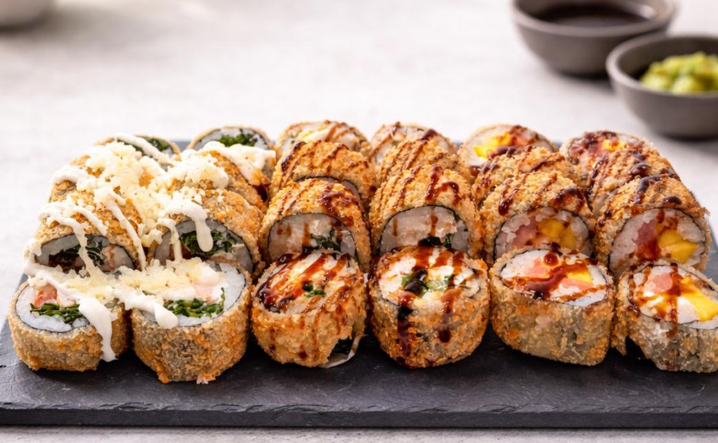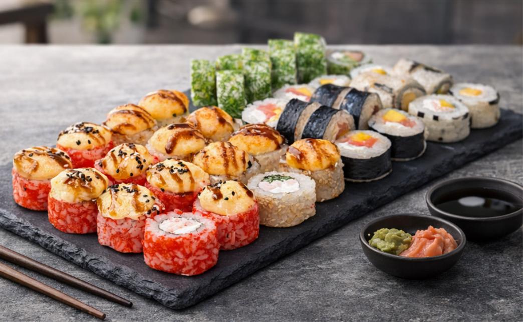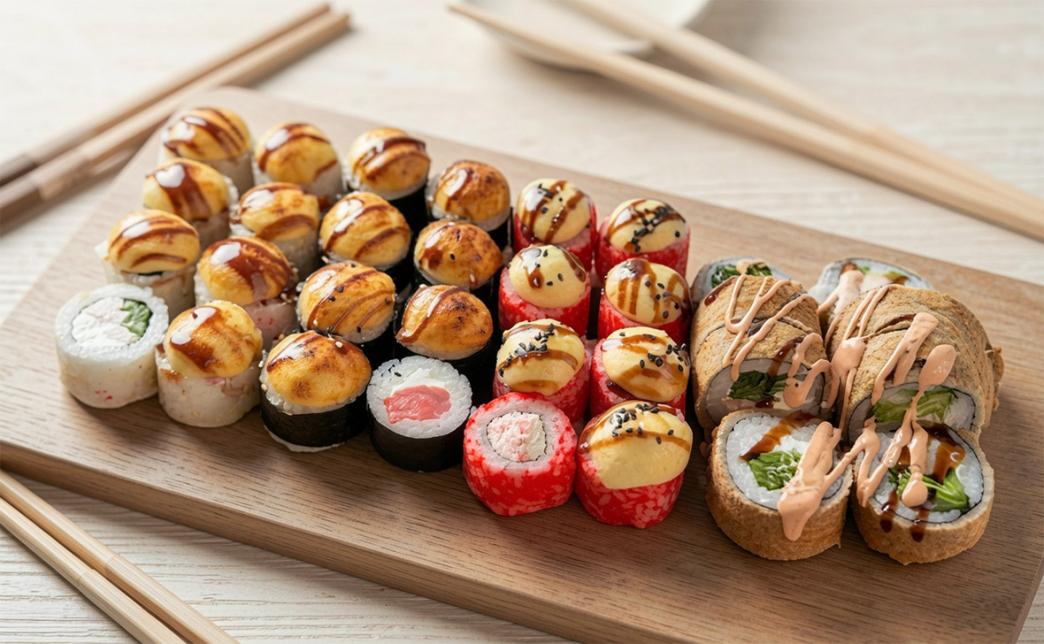 - Служба доставки "Aura Sushi" предлагает разнообразные сеты с популярными роллами - от классических "Филадельфия" и "Калифорния" до запеченных и темпура роллов